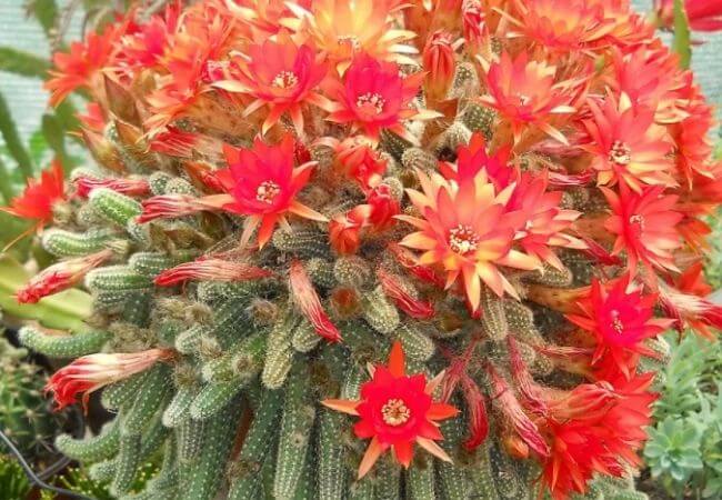 Esse cacto tem um formato diferente, com ramificações grossas, cobertas de espinhos e longas, podendo chegar a 1 metro de comprimento. Suas flores são exuberantes e delicadas, contrastando com a rusticidade dos ramos. Gosta de sol pleno, regas moderadas e embora prefira temperaturas entre 20 e 32 graus, sobrevive nas épocas mais frias.