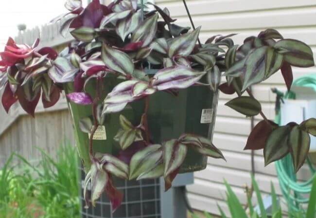 Essa é a Tradescantia zebrina, uma planta de forração para jardins que tem uma folhagem bicolor muito bonita, gosta de solo úmido e, se por acaso ficar à meia sombra, vai continuar saudável.