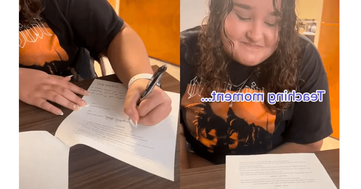 As imagens mostram a garota aparece lendo e assinando um contrato de aluguel. Na legenda, ela explicou a situação. “Quando sua filha de 18 anos decide ficar em casa”, escreveu enquanto mostra o contrato de aluguel.
